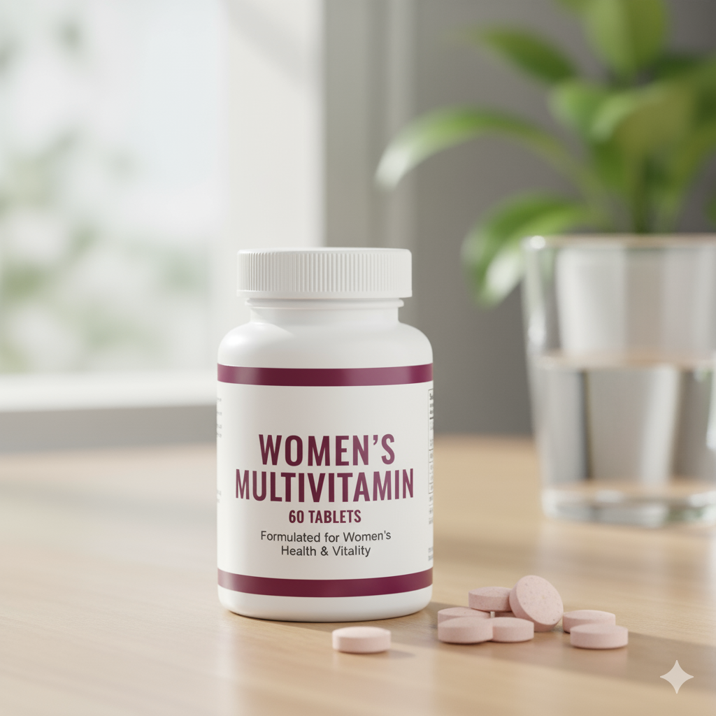 Women’s multivitamin blend — includes iron, folic acid, calcium, B vitamins. Helps daily nutritional needs for women.